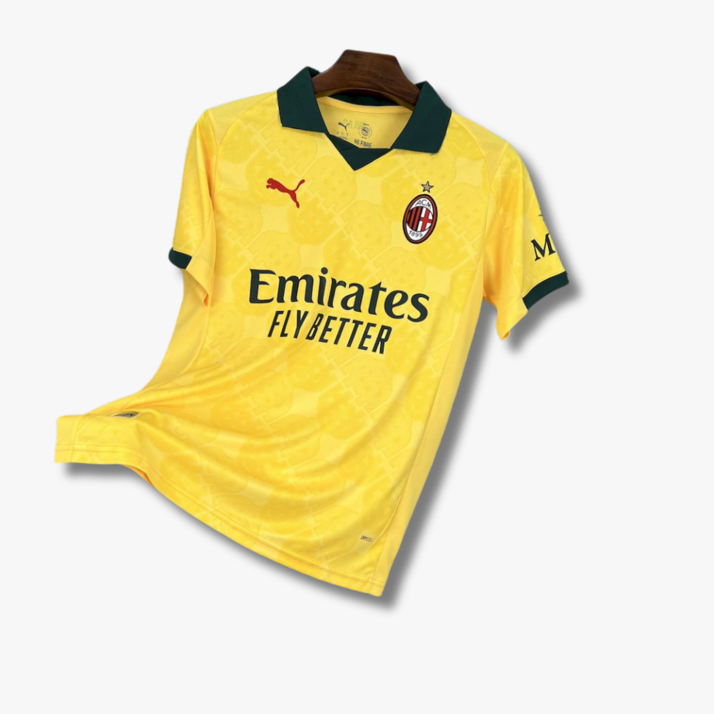 El jersey alternativo del AC Milan para la temporada 25/26 presenta una propuesta vibrante y elegante, con un llamativo tono amarillo como base principal que rompe con lo tradicional sin perder identidad. El diseño incorpora un patrón gráfico sutil integrado en la tela, aportando textura y profundidad visual sin sobrecargar la prenda.