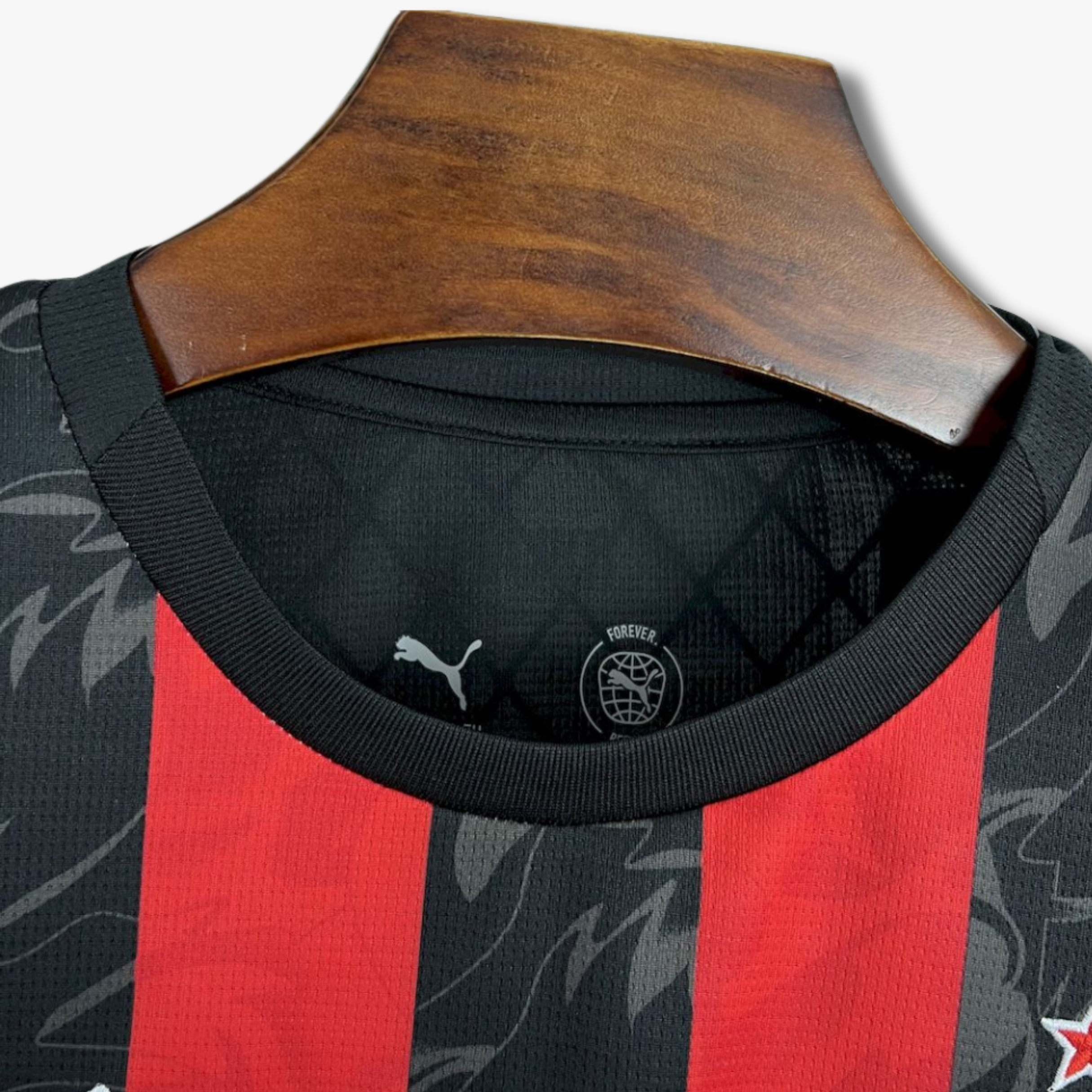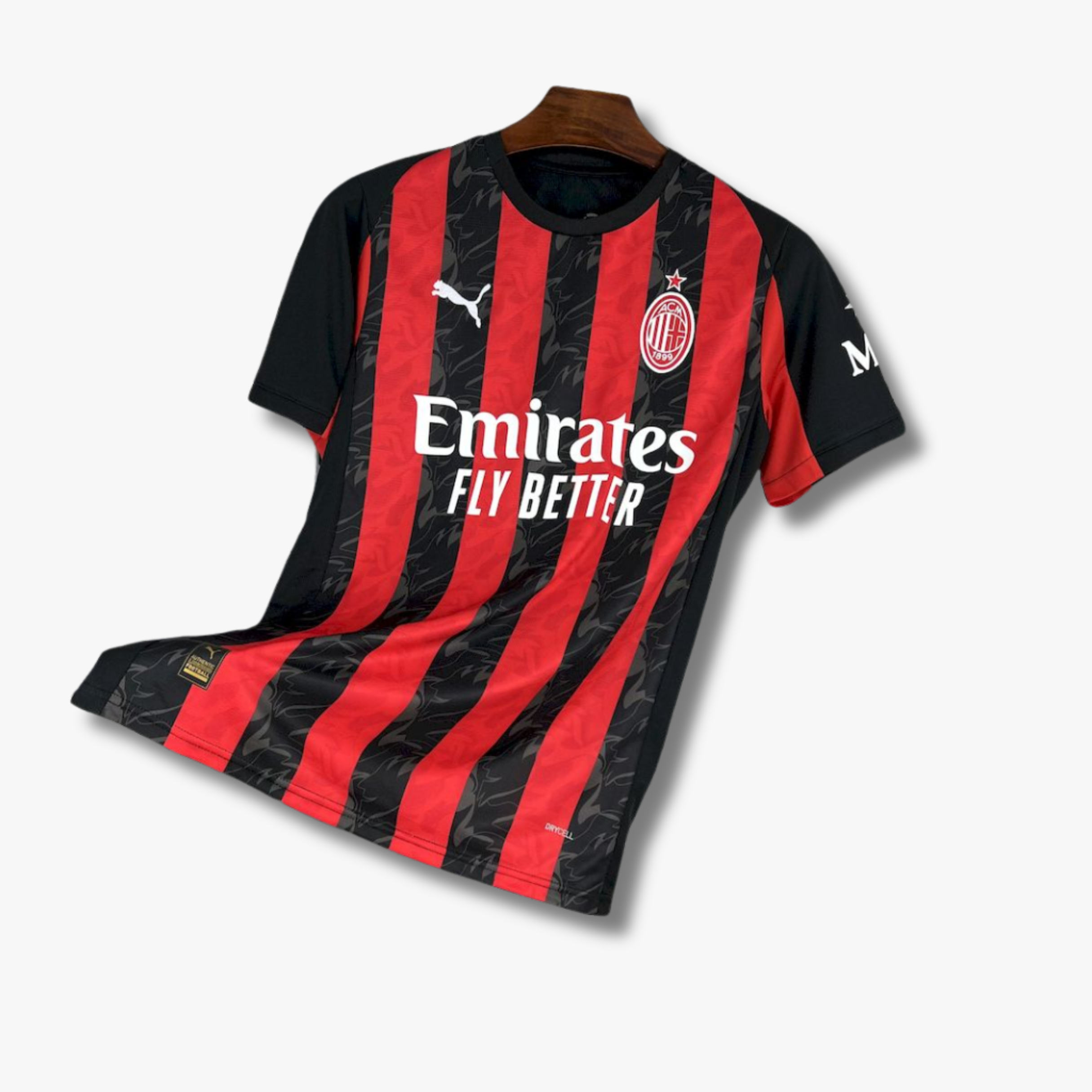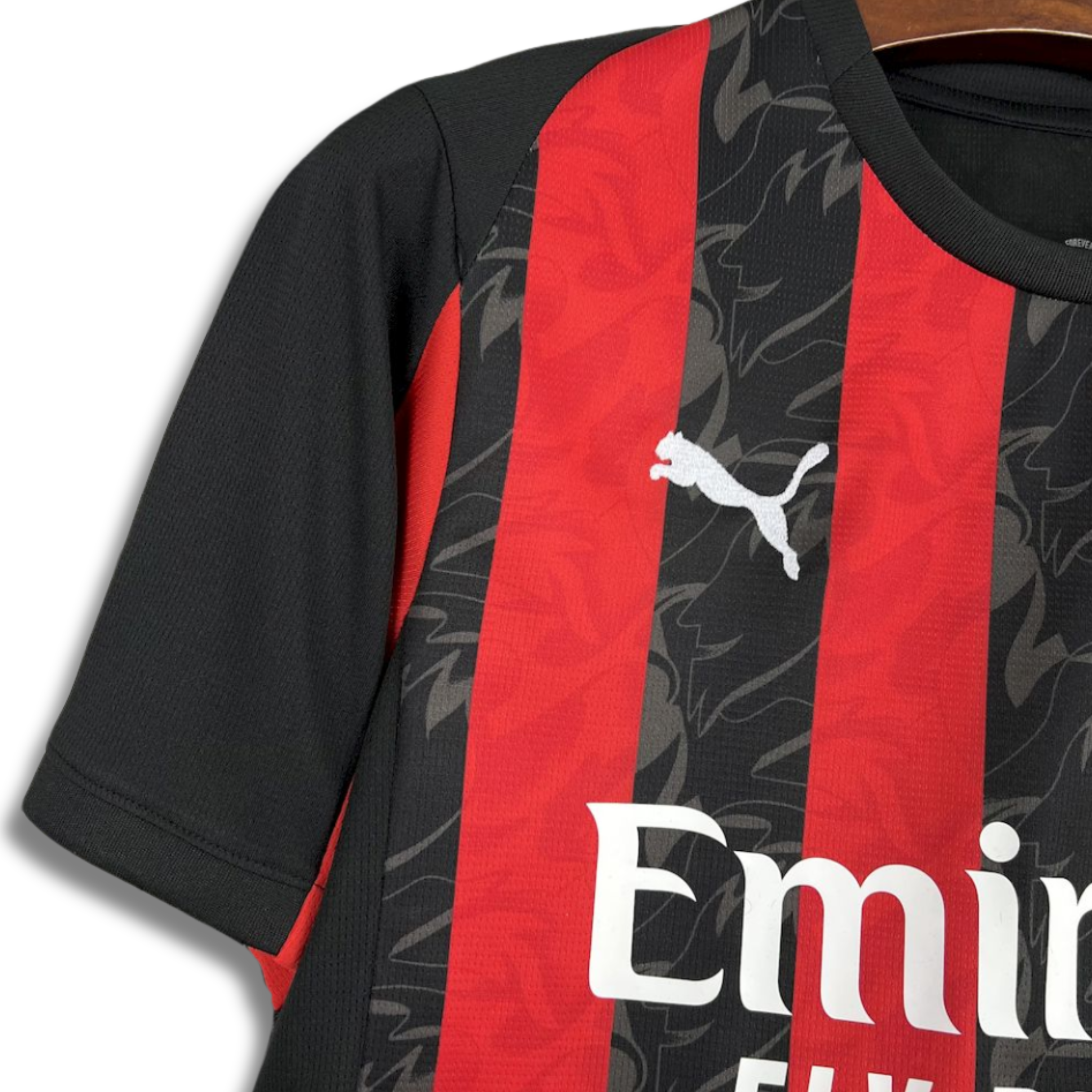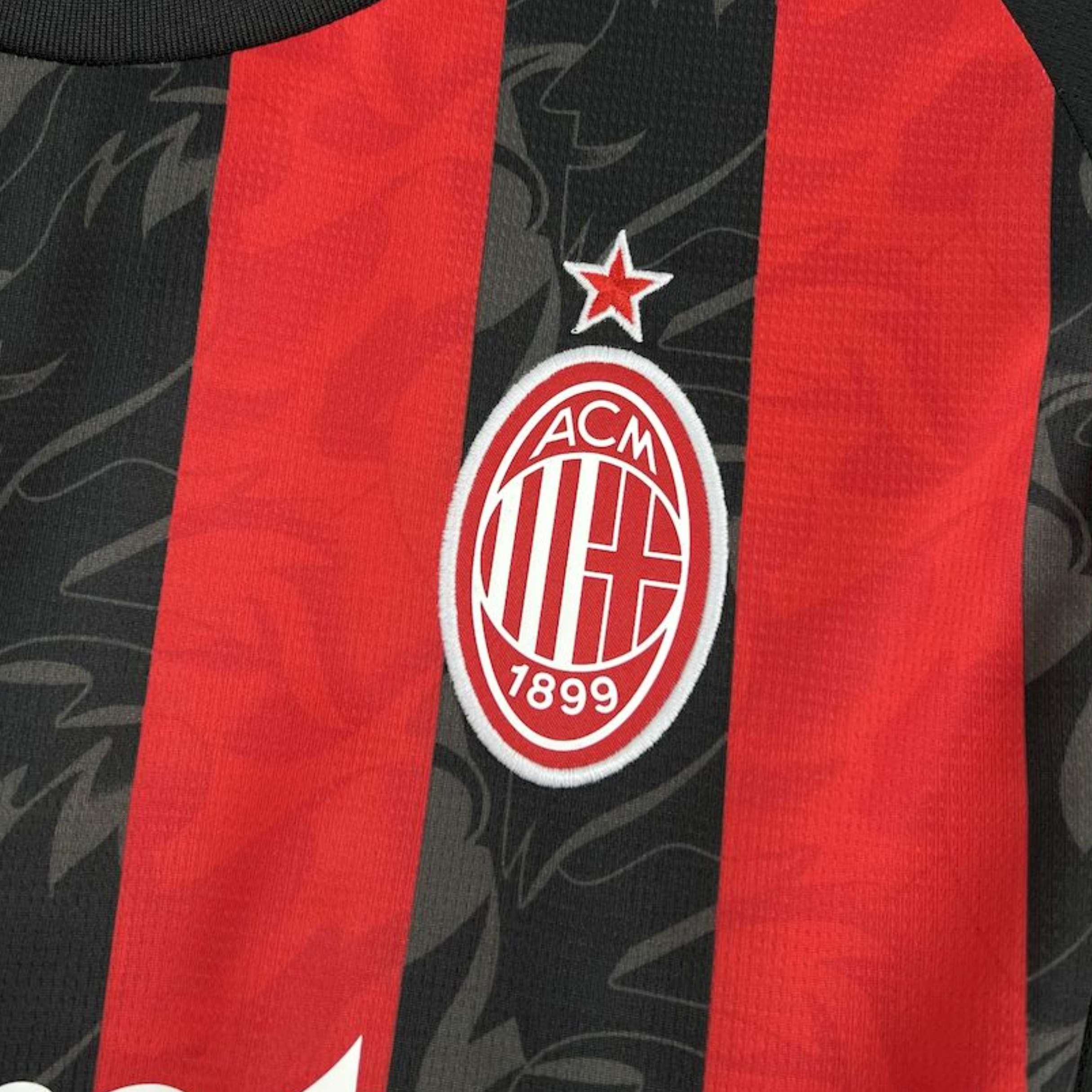 El jersey de local del AC Milan para la temporada 25/26 mantiene la esencia histórica del club con sus clásicas franjas verticales en rojo y negro, reinterpretadas con un enfoque moderno. El diseño incorpora un patrón gráfico tonal integrado en las franjas oscuras, aportando textura y profundidad visual sin alterar la identidad tradicional.