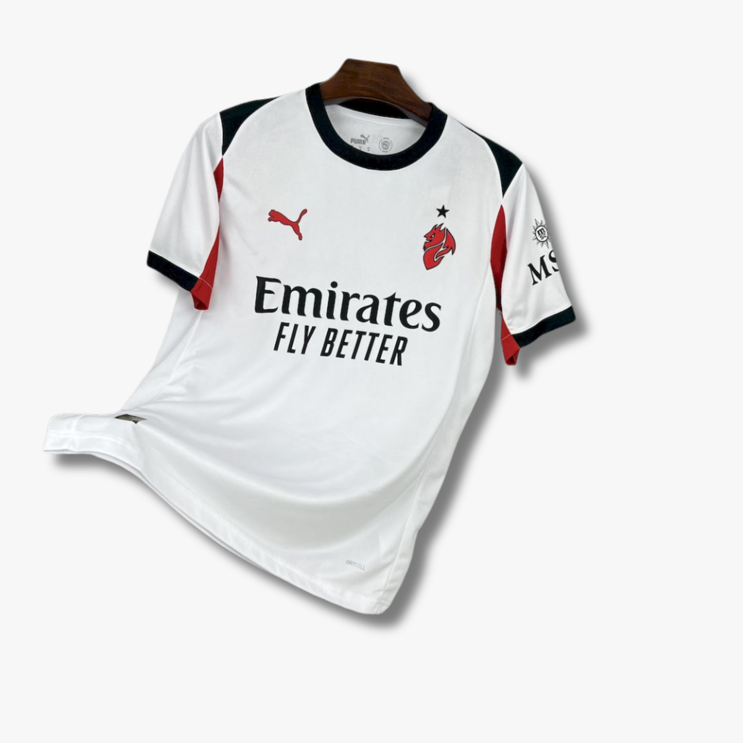 El jersey de visita del AC Milan para la temporada 25/26 presenta una propuesta limpia y elegante, dominada por el blanco como color principal. El diseño mantiene una estética sobria, complementada con detalles en negro y rojo en los hombros y costados que aportan contraste y refuerzan la identidad del club.