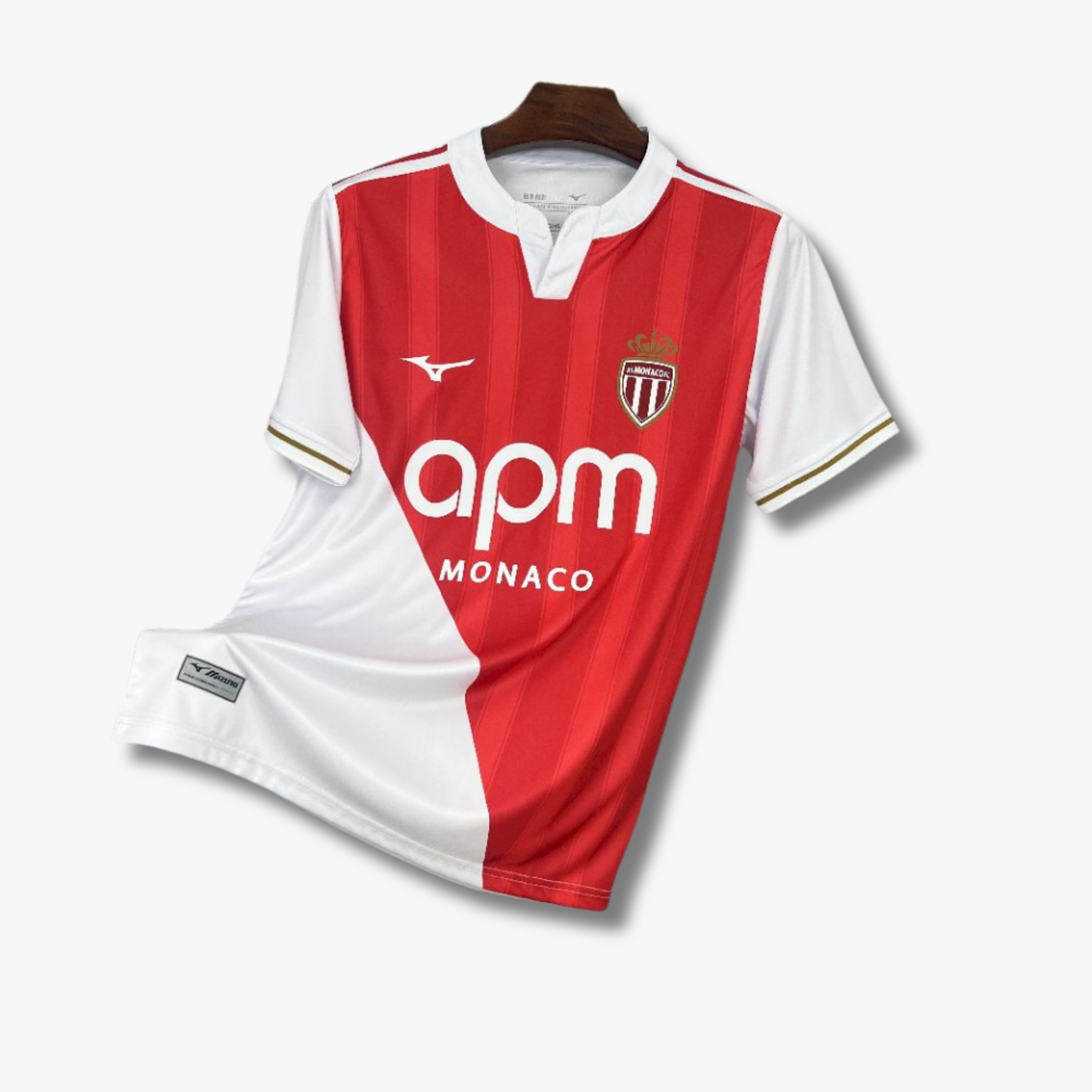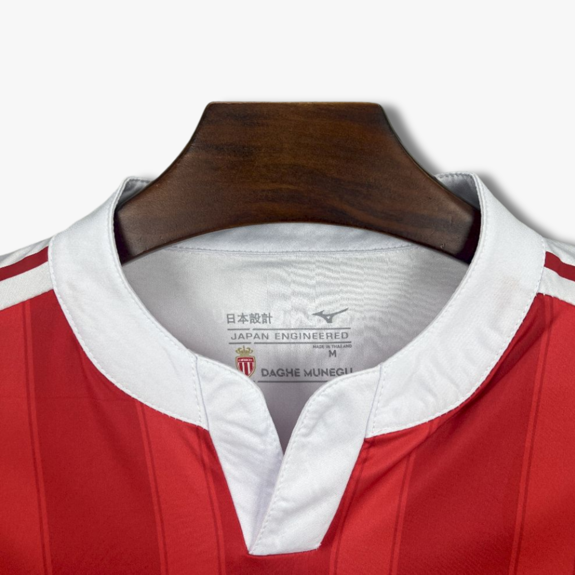 El jersey de local del AS Monaco para la temporada 25/26 conserva su icónico diseño diagonal en rojo y blanco, símbolo histórico del club. La zona roja incorpora un sutil patrón de líneas verticales que aporta textura y profundidad visual, mientras que las mangas blancas mantienen un acabado limpio con detalles finos en los puños. El cuello tipo abierto en color blanco añade un toque moderno y elegante que complementa perfectamente el contraste clásico del uniforme.