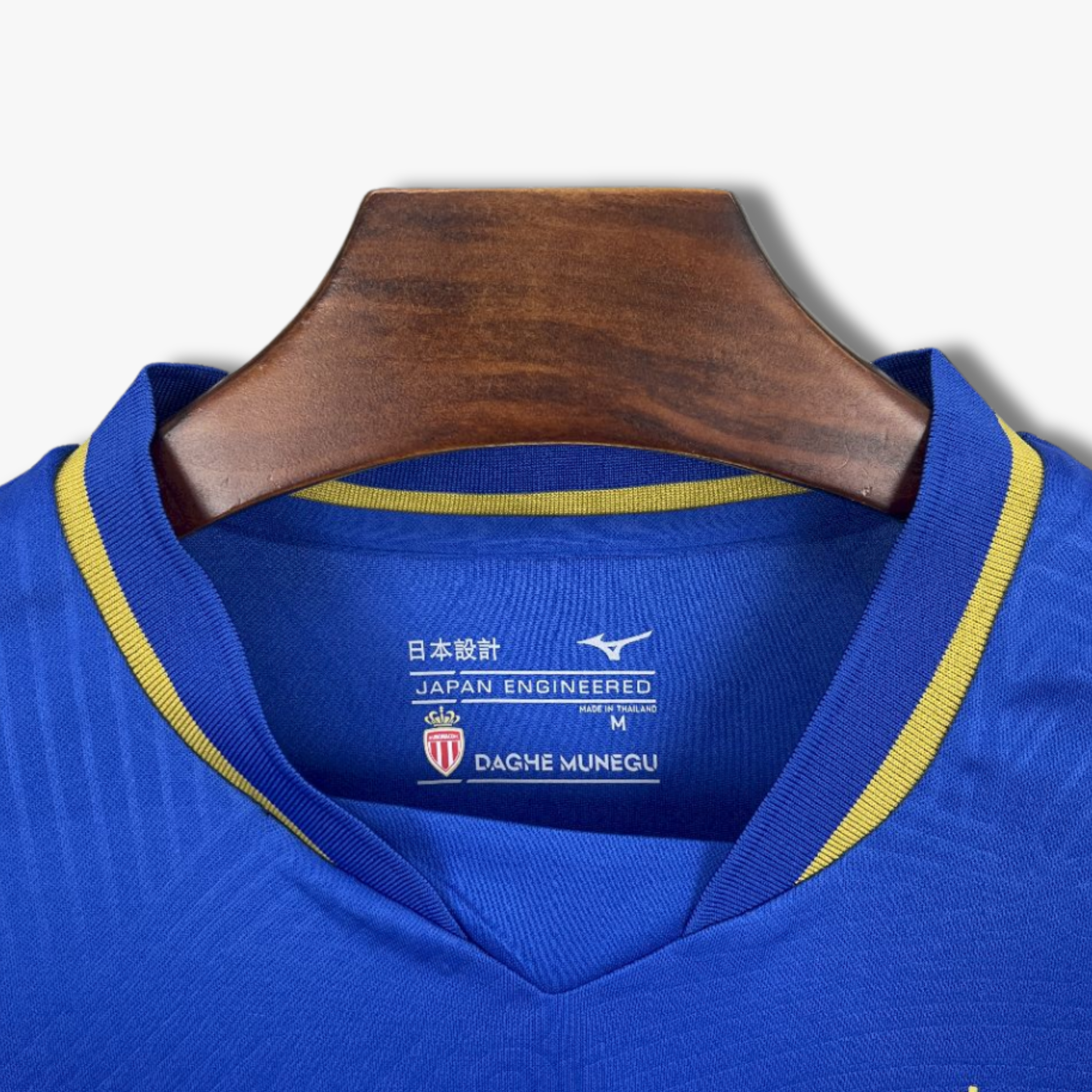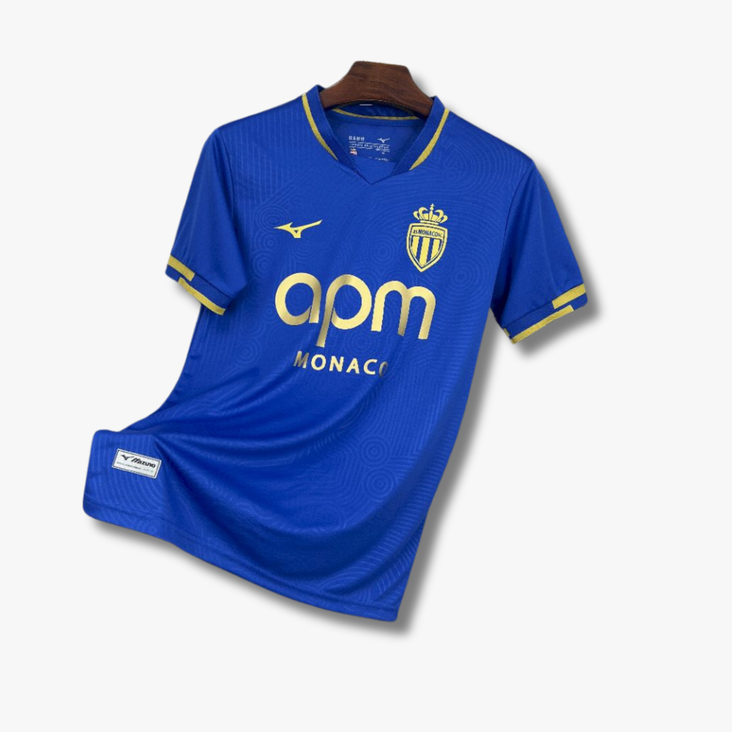El jersey de visita del AS Monaco para la temporada 25/26 apuesta por un diseño moderno en tono azul intenso como base, acompañado de detalles en color dorado que realzan su identidad elegante. El tejido incorpora un patrón gráfico tonal con formas circulares sutiles que aportan textura y profundidad sin sobrecargar el diseño. El cuello en “V” presenta un acabado con línea dorada, al igual que los puños, generando un contraste limpio y sofisticado.