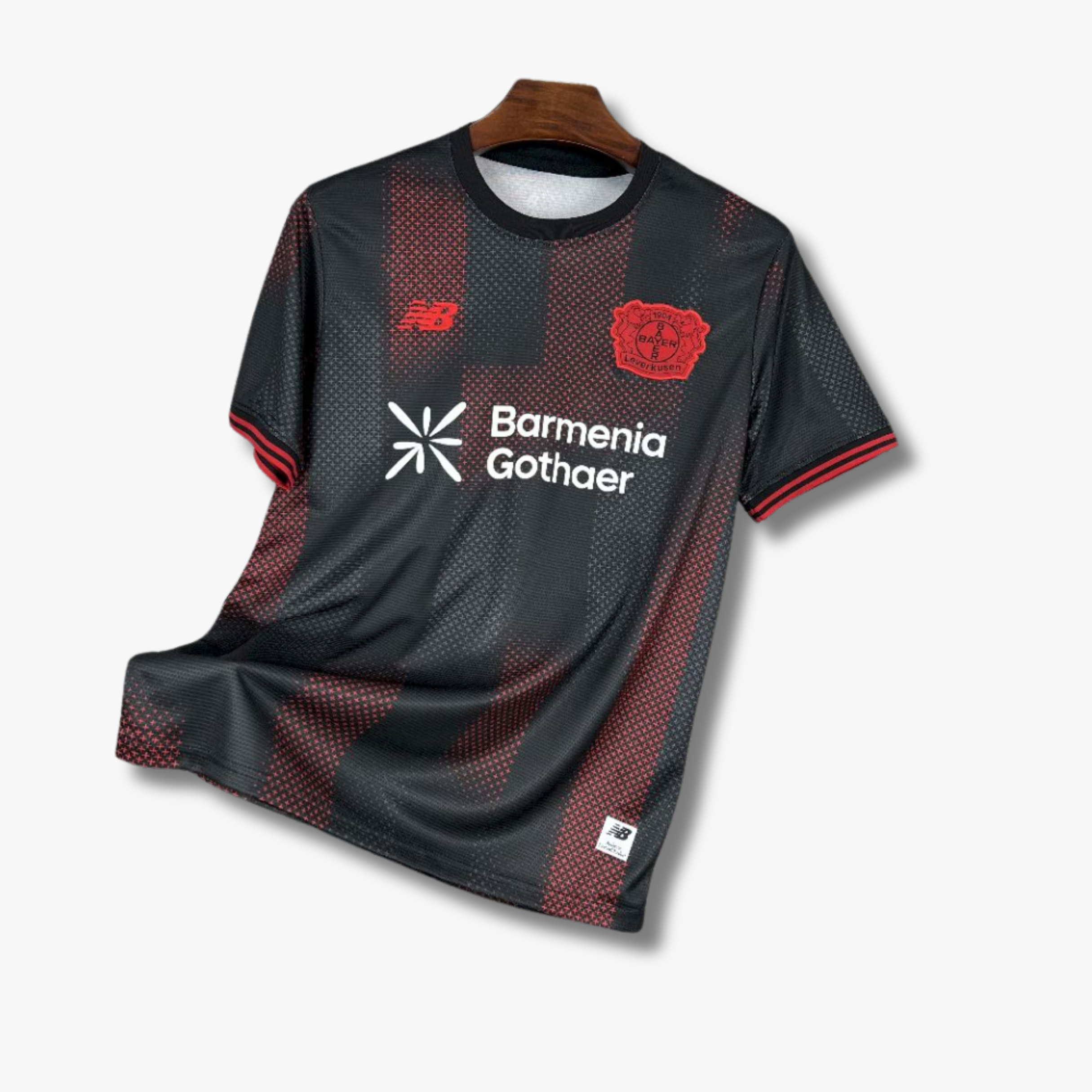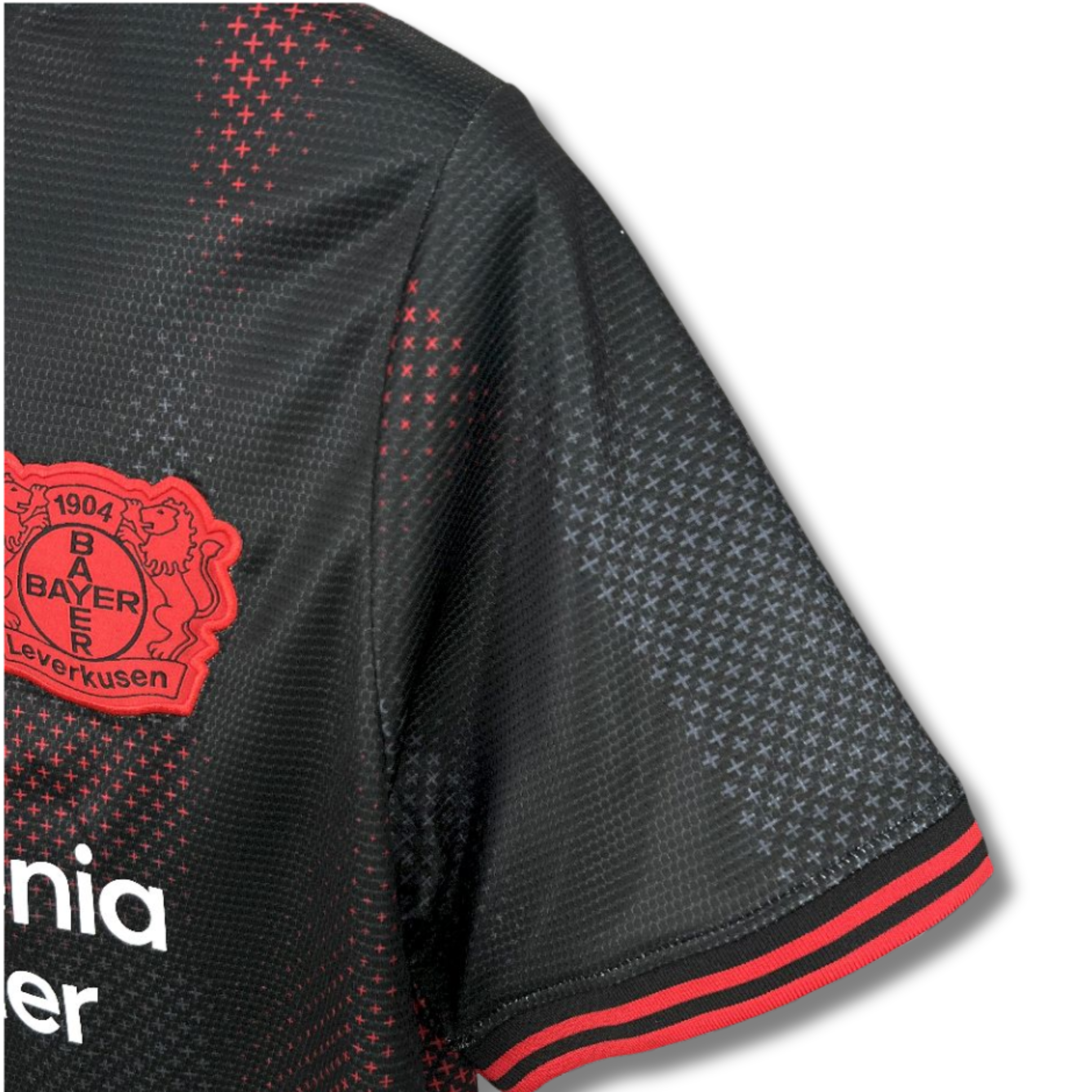 El jersey de local del Bayer Leverkusen para la temporada 25/26 apuesta por una estética moderna y potente, combinando el negro como base principal con detalles gráficos en rojo que refuerzan la identidad histórica del club. El diseño incorpora un patrón geométrico sutil distribuido en bloques verticales, creando un efecto dinámico y contemporáneo.