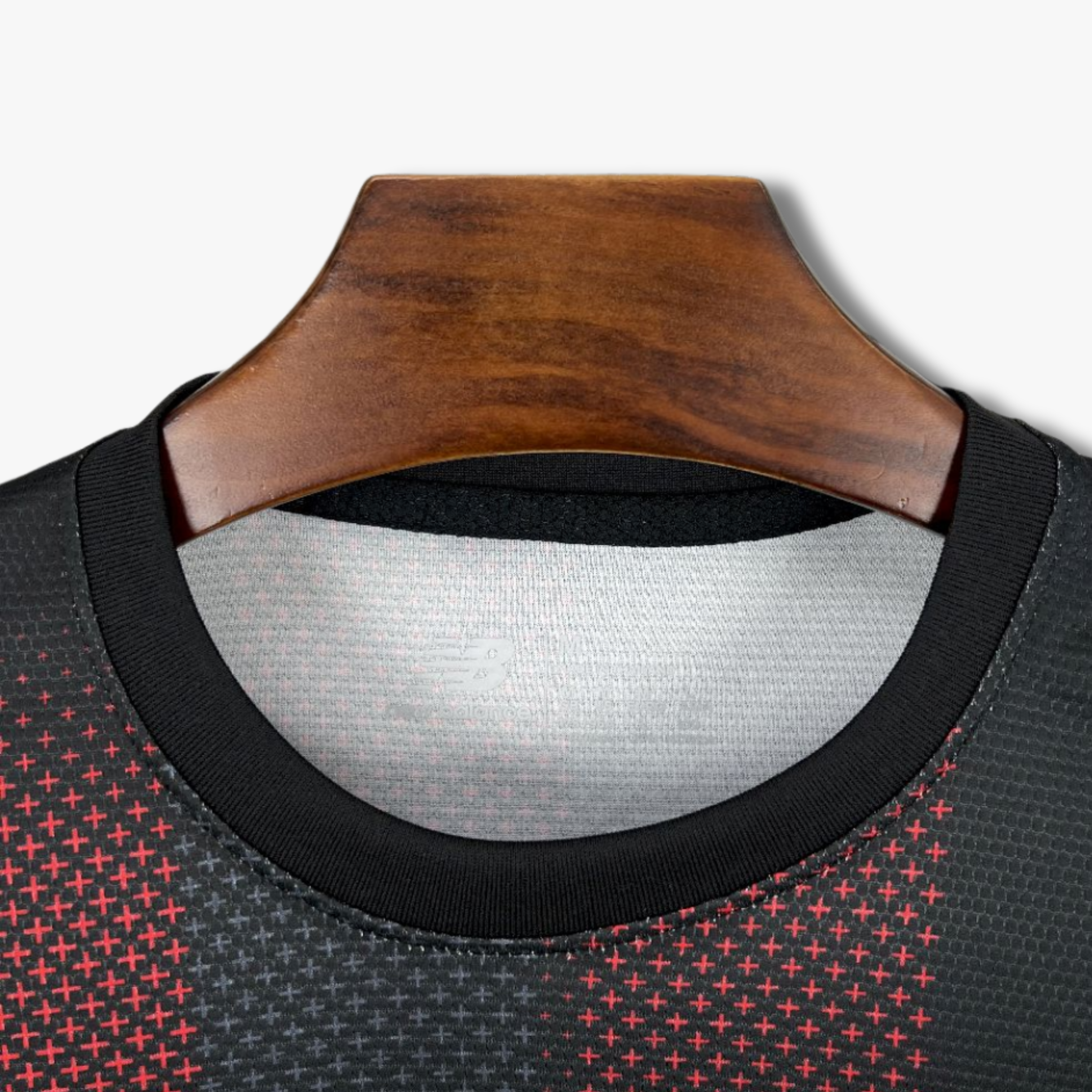 El escudo del club, en una versión monocromática roja, destaca sobre el fondo oscuro aportando contraste y carácter. El cuello redondo en color negro mantiene una línea sobria, mientras que los puños presentan franjas rojas que añaden un toque distintivo y equilibrado al conjunto.