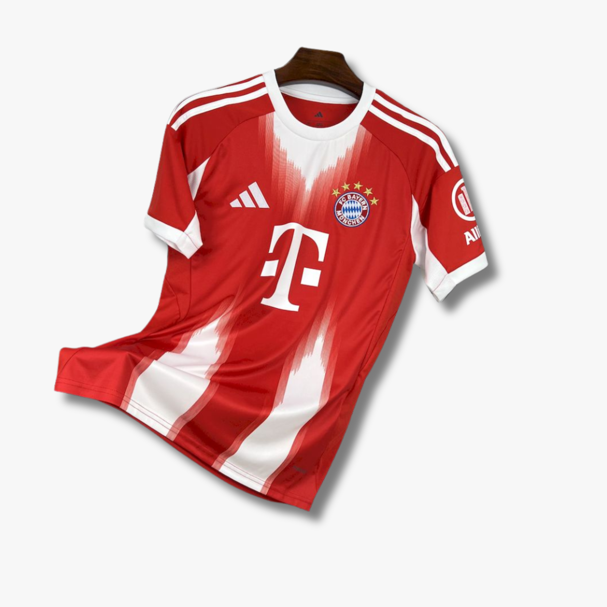Las tres franjas blancas en los hombros refuerzan la identidad clásica, mientras que el cuello redondo en contraste aporta un acabado limpio y elegante. El escudo oficial del Bayern Múnich bordado en el pecho, acompañado por las estrellas doradas que simbolizan sus títulos, destaca con gran definición y representa la grandeza y tradición del club en cada partido en el Allianz Arena durante la temporada 25/26.