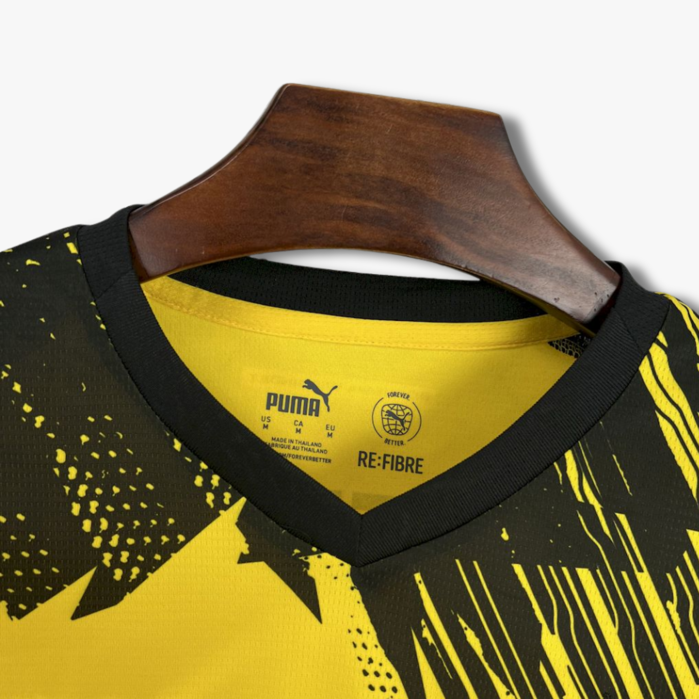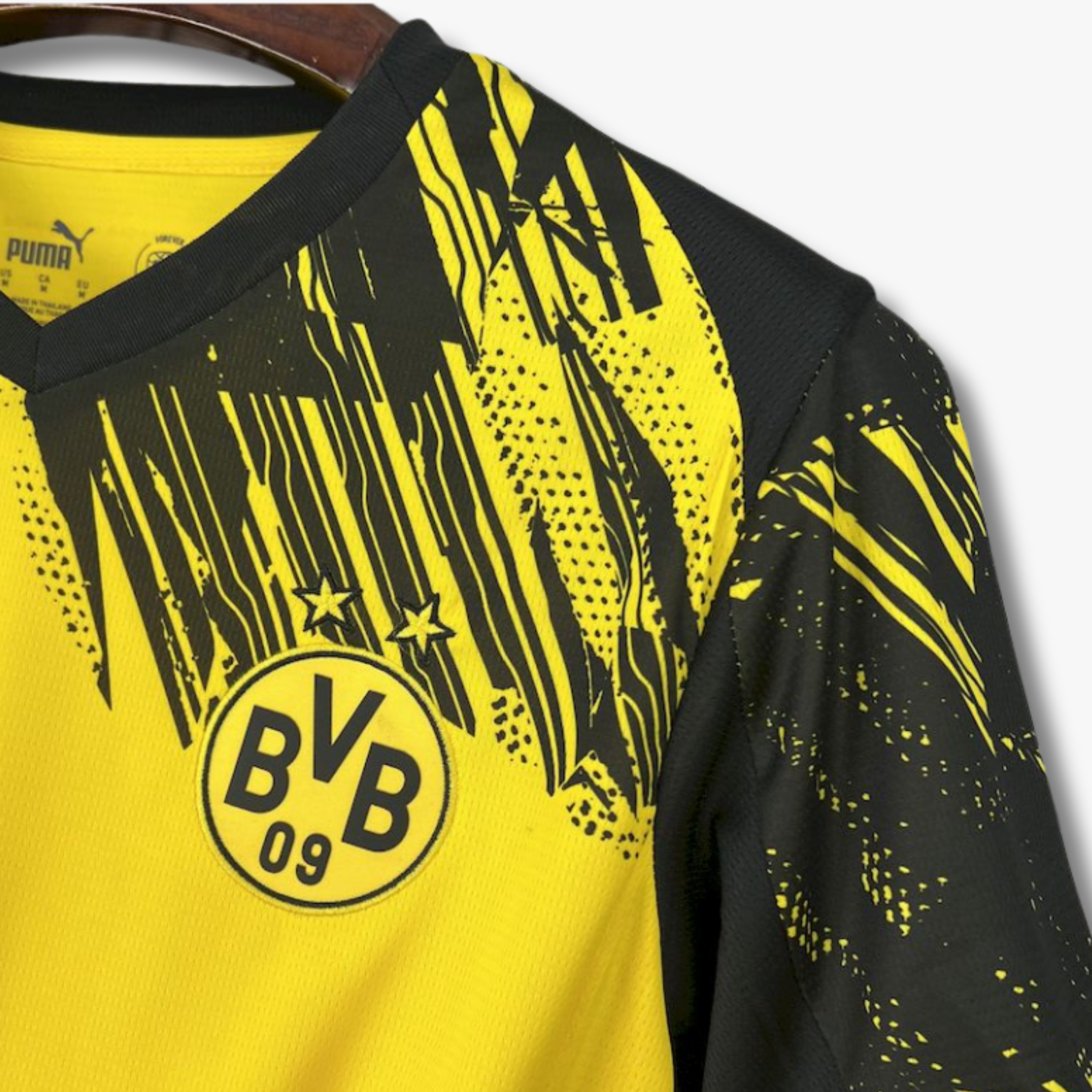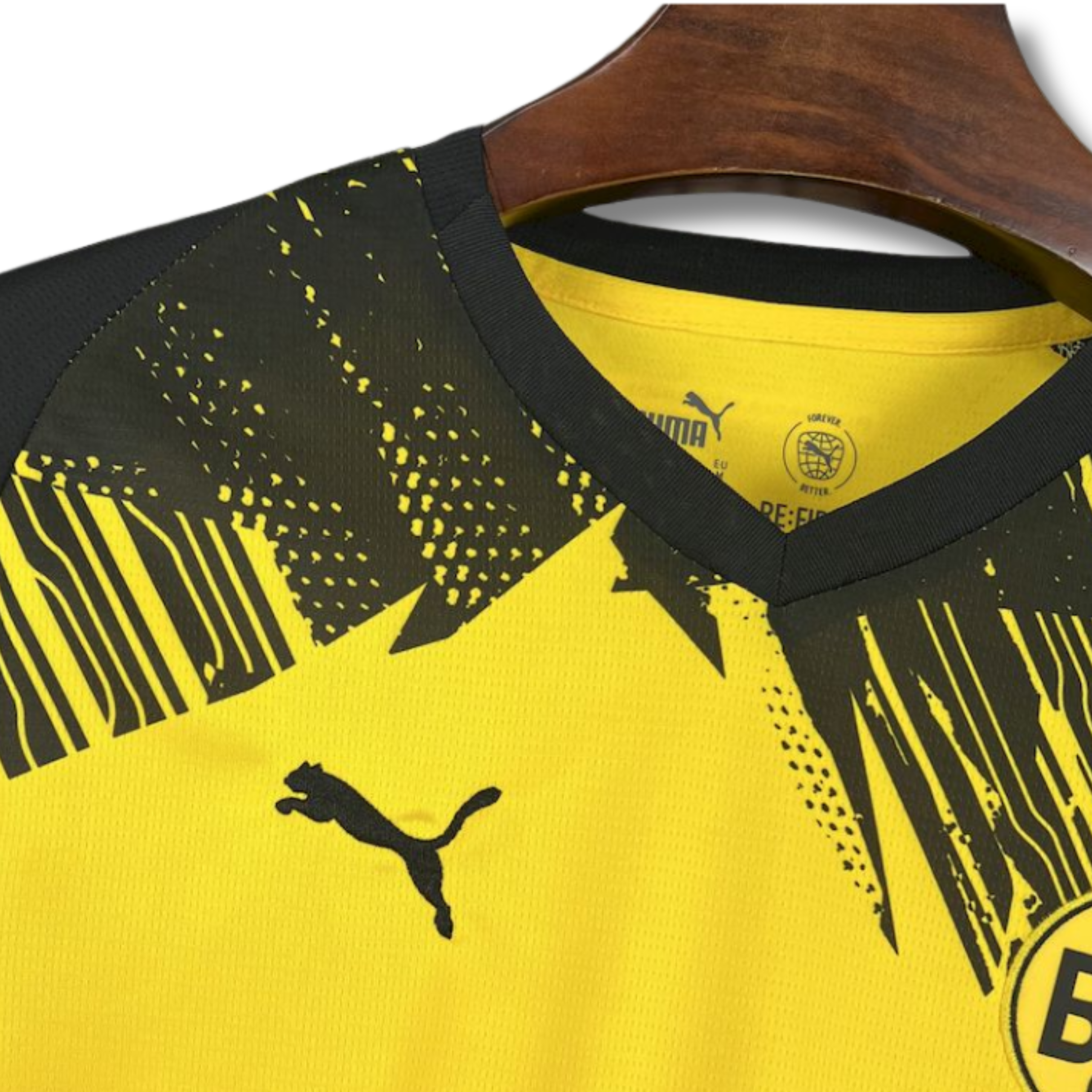 El patrón gráfico en la parte superior del pecho y los hombros, con trazos irregulares y efecto dinámico, genera una sensación de movimiento y agresividad visual que refleja la intensidad con la que el equipo afronta cada partido en el Signal Iduna Park. Las mangas en negro equilibran la composición y refuerzan el contraste, mientras que el escudo del Borussia Dortmund en el pecho destaca con orgullo junto al logotipo del fabricante, consolidando la identidad del club.