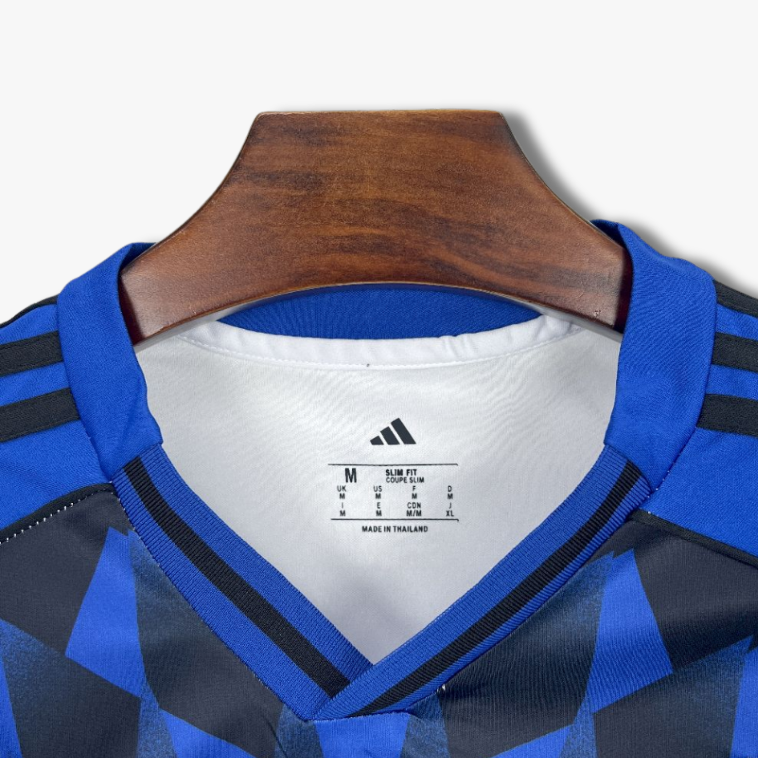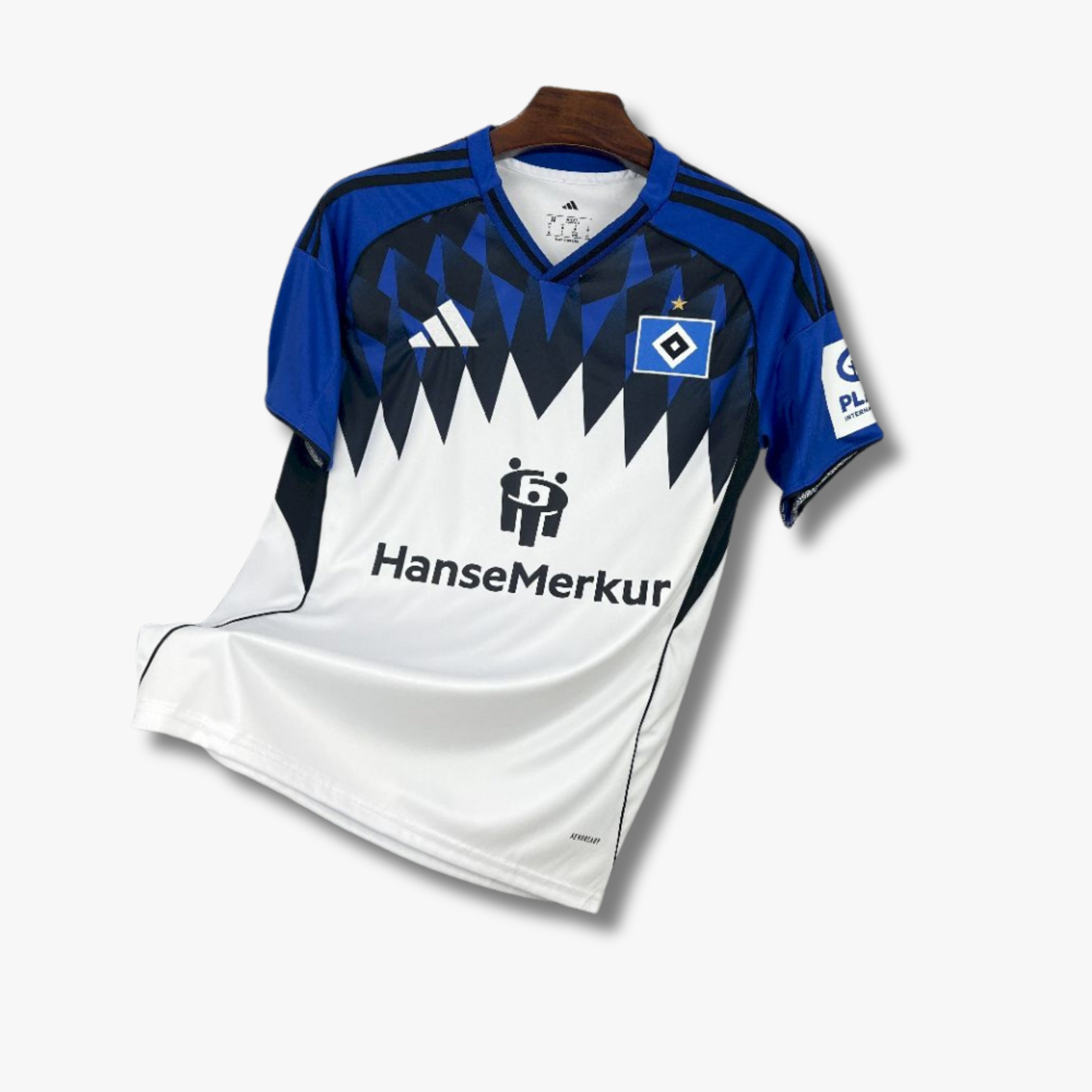 El escudo del HSV bordado destaca sobre el fondo azul, acompañado por la estrella dorada que simboliza los títulos históricos del club. El logotipo de adidas también está bordado, ofreciendo un acabado premium y mayor durabilidad. El cuello en corte “V” con detalles en azul y negro refuerza la estética contemporánea, mientras que las mangas en azul sólido equilibran visualmente el diseño.