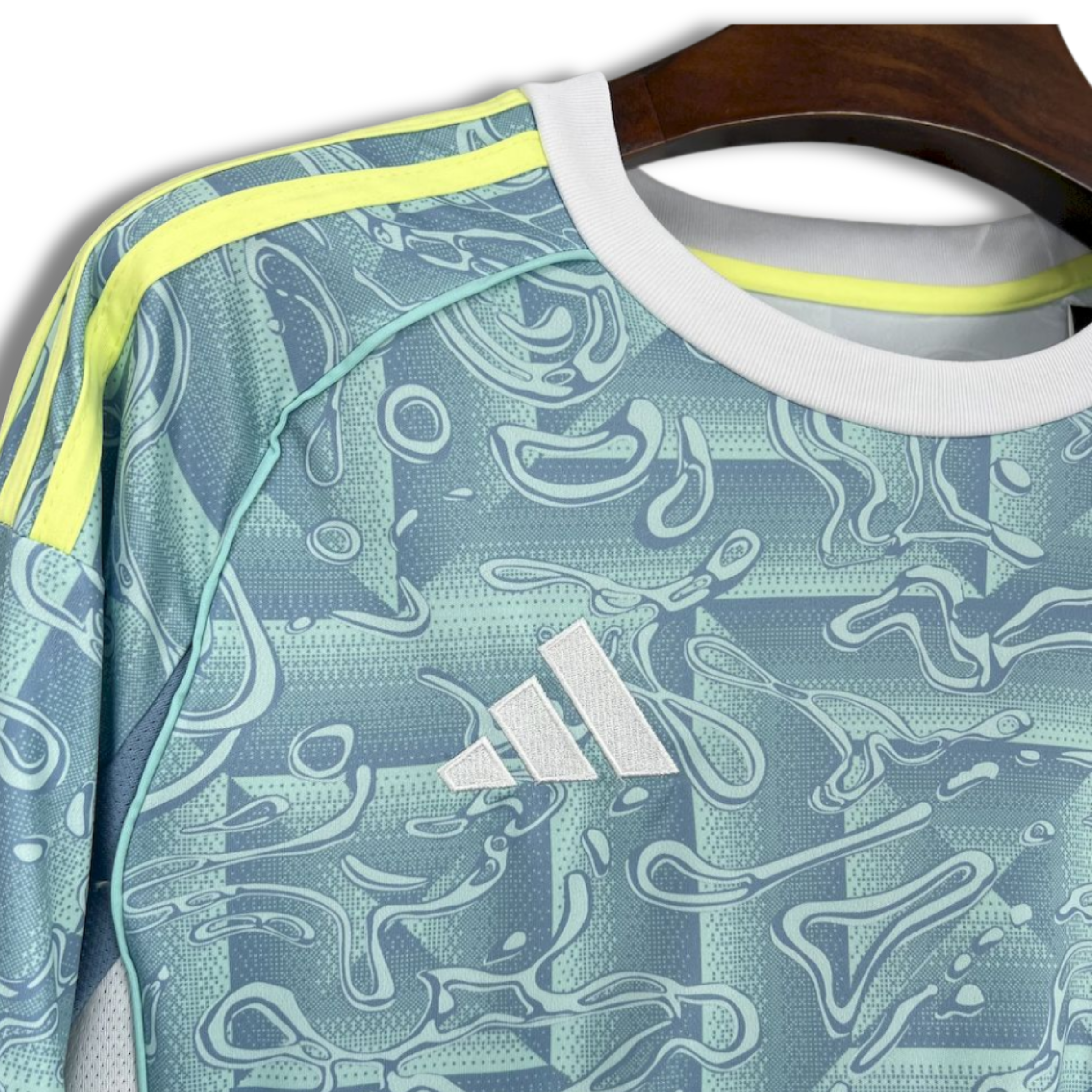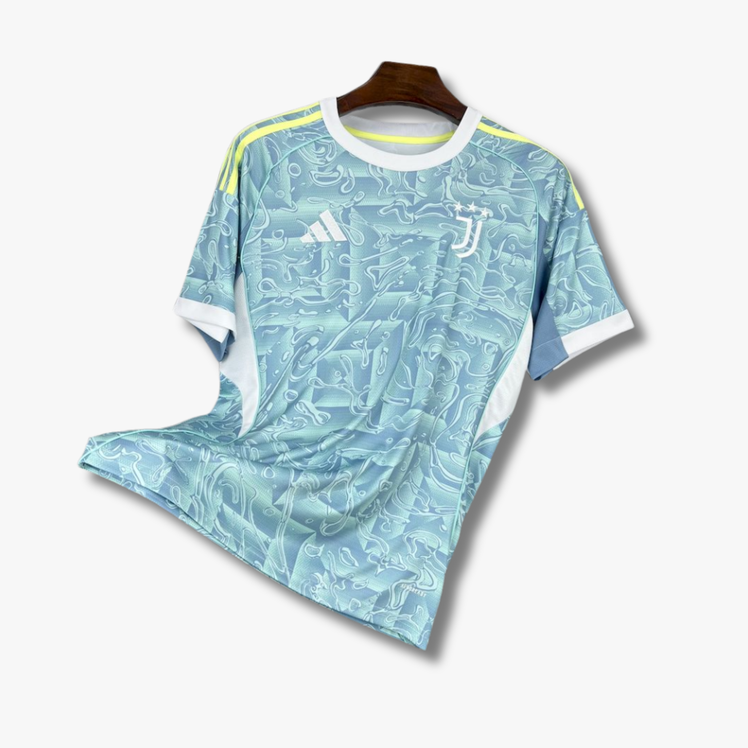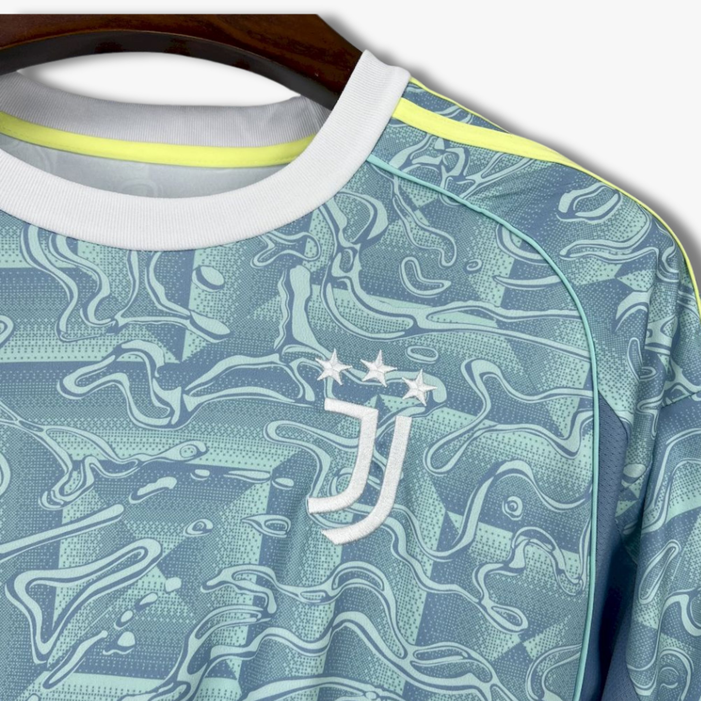 El jersey de visita de la Juventus para la temporada 25/26 presenta un diseño fresco y vibrante en tonos celestes con un patrón gráfico abstracto que aporta dinamismo y modernidad. El estampado fluido cubre toda la prenda, creando una textura visual llamativa que refuerza el carácter innovador del uniforme.