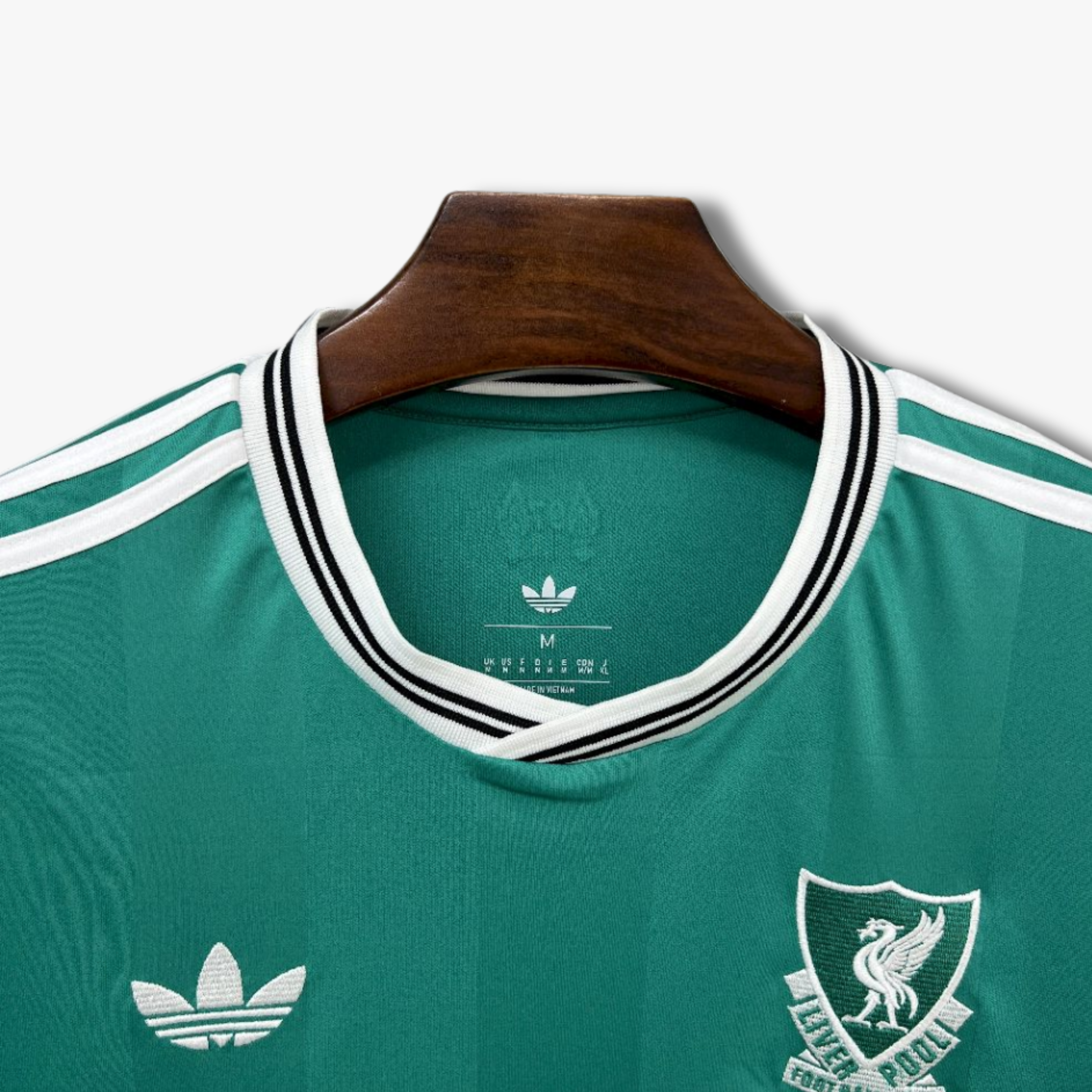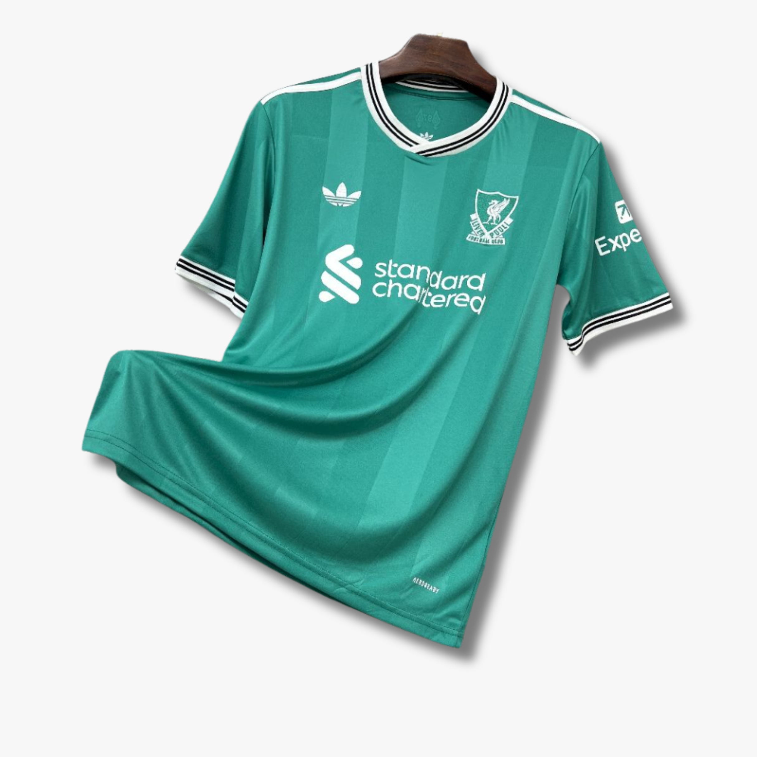 Este jersey del Liverpool FC Alternativo de la temporada 25/26 presenta una propuesta fresca y distintiva que ofrece una nueva forma de representar al club lejos de Anfield. El tono verde dominante aporta una identidad moderna y elegante, reforzada por un diseño de franjas verticales sutiles que añaden profundidad visual sin perder sobriedad. Los detalles en blanco y negro en el cuello y las mangas generan un contraste equilibrado, mientras que el escudo del club y el logotipo clásico aportan un aire retro que conecta la tradición del Liverpool con una estética contemporánea.