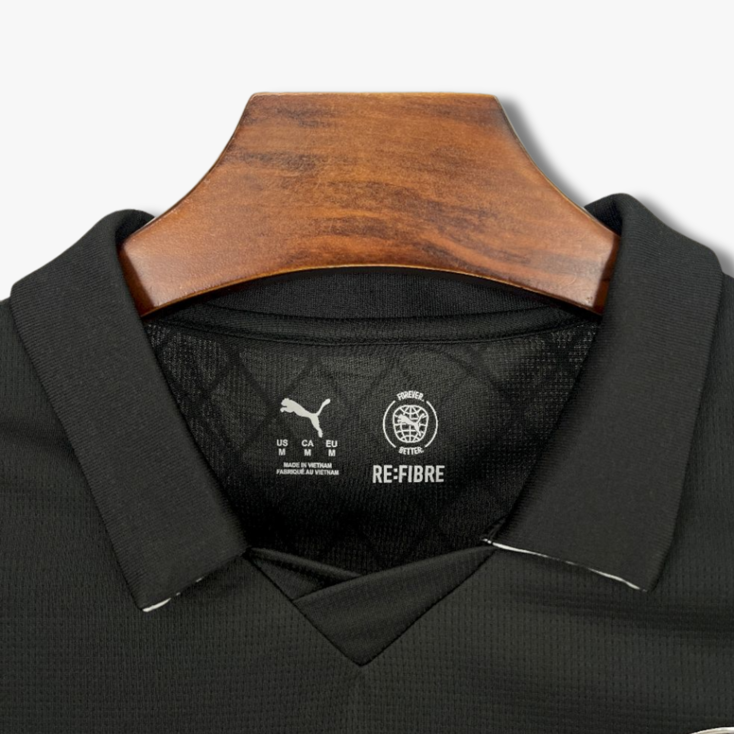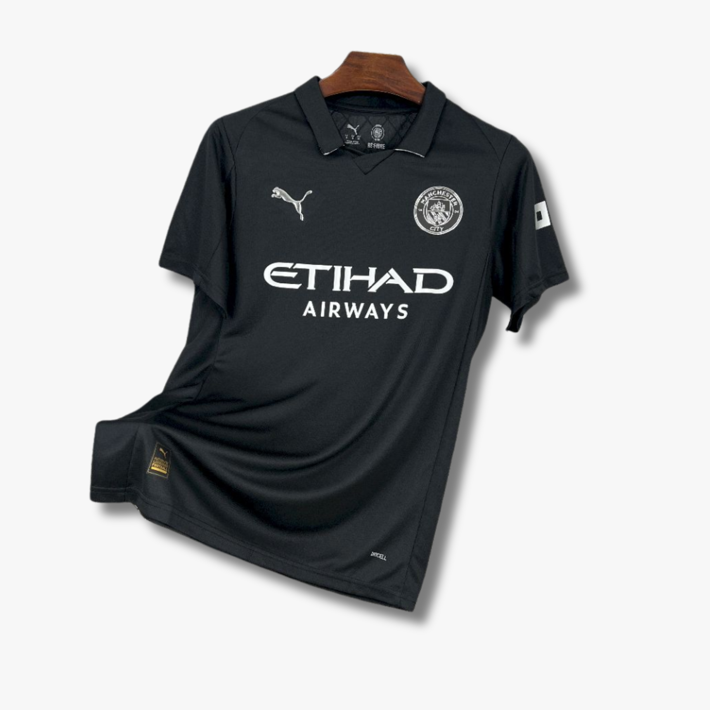 El escudo del Manchester City en versión monocromática mantiene la identidad del club con un acabado contemporáneo, acompañado por el logo de Puma y el patrocinador Etihad Airways al frente. El cuello tipo polo añade un toque clásico que equilibra la estética minimalista del conjunto, convirtiéndolo en una pieza distintiva de la temporada 25/26.