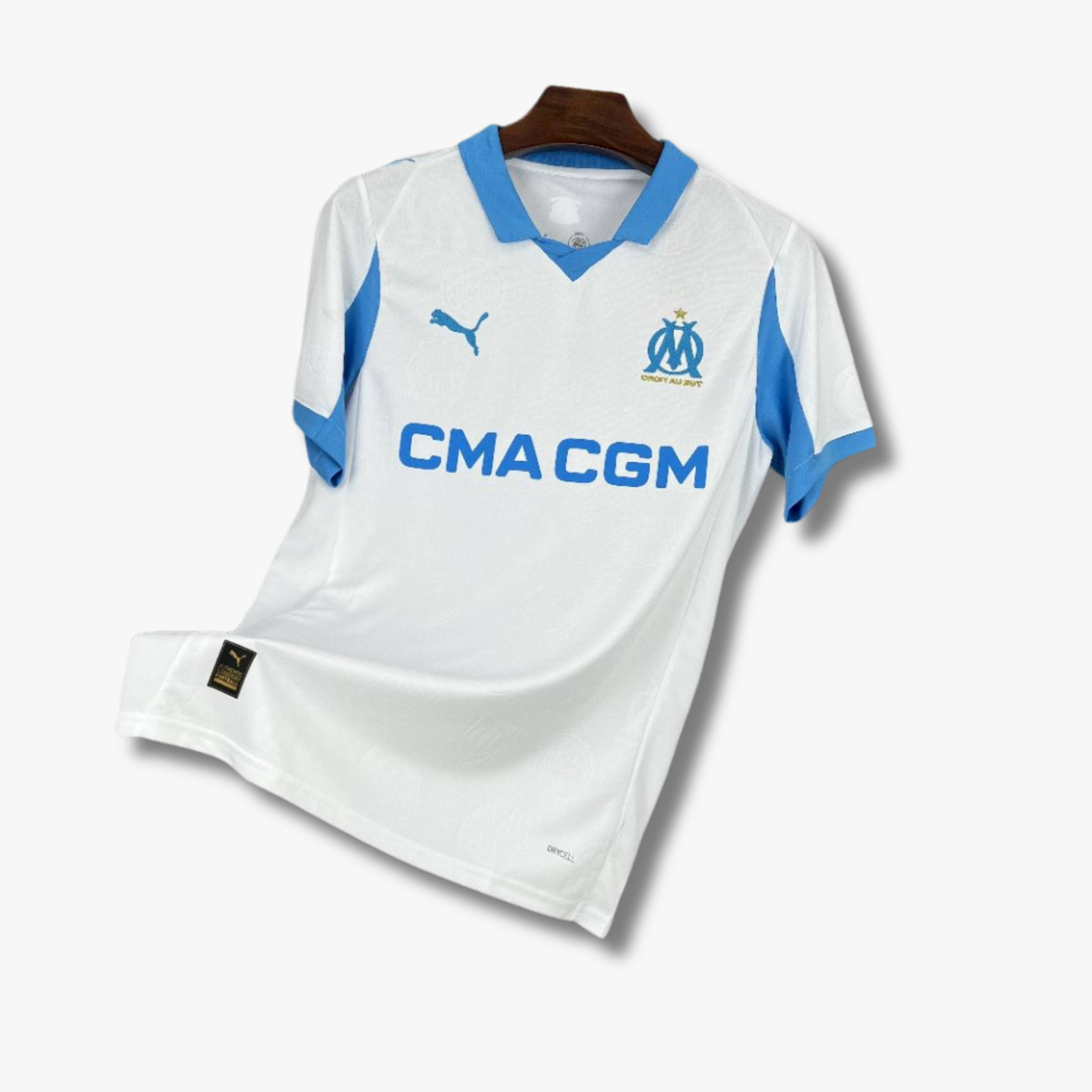 El jersey de local del Olympique de Marseille para la temporada 25/26 mantiene la esencia clásica del club con un diseño predominantemente blanco que transmite elegancia y tradición. Los detalles en azul celeste en el cuello y las mangas aportan contraste y refuerzan la identidad visual del equipo, mientras que el patrón tonal sutil en el tejido añade profundidad sin romper la estética limpia. El cuello tipo polo con escote en “V” le da un toque moderno y distintivo.