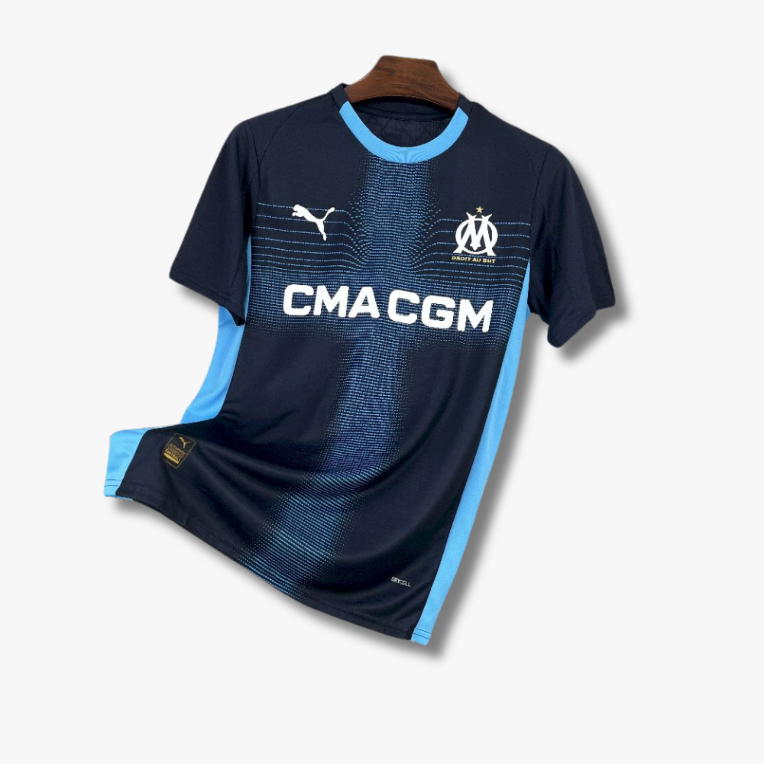 El jersey de visita del Olympique de Marseille para la temporada 25/26 apuesta por un diseño en azul marino que proyecta fuerza y modernidad. El gráfico frontal con líneas horizontales en azul celeste crea un efecto dinámico que aporta profundidad y movimiento al conjunto, mientras que los paneles laterales en tono más claro estilizan la silueta. El cuello redondo con acabado en azul celeste refuerza el contraste y le da un toque distintivo y contemporáneo.