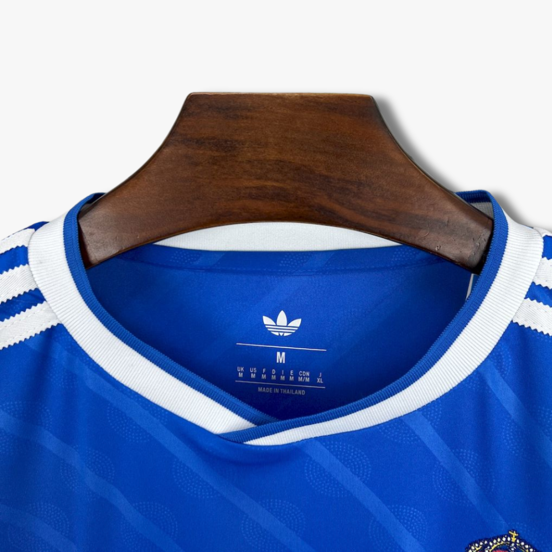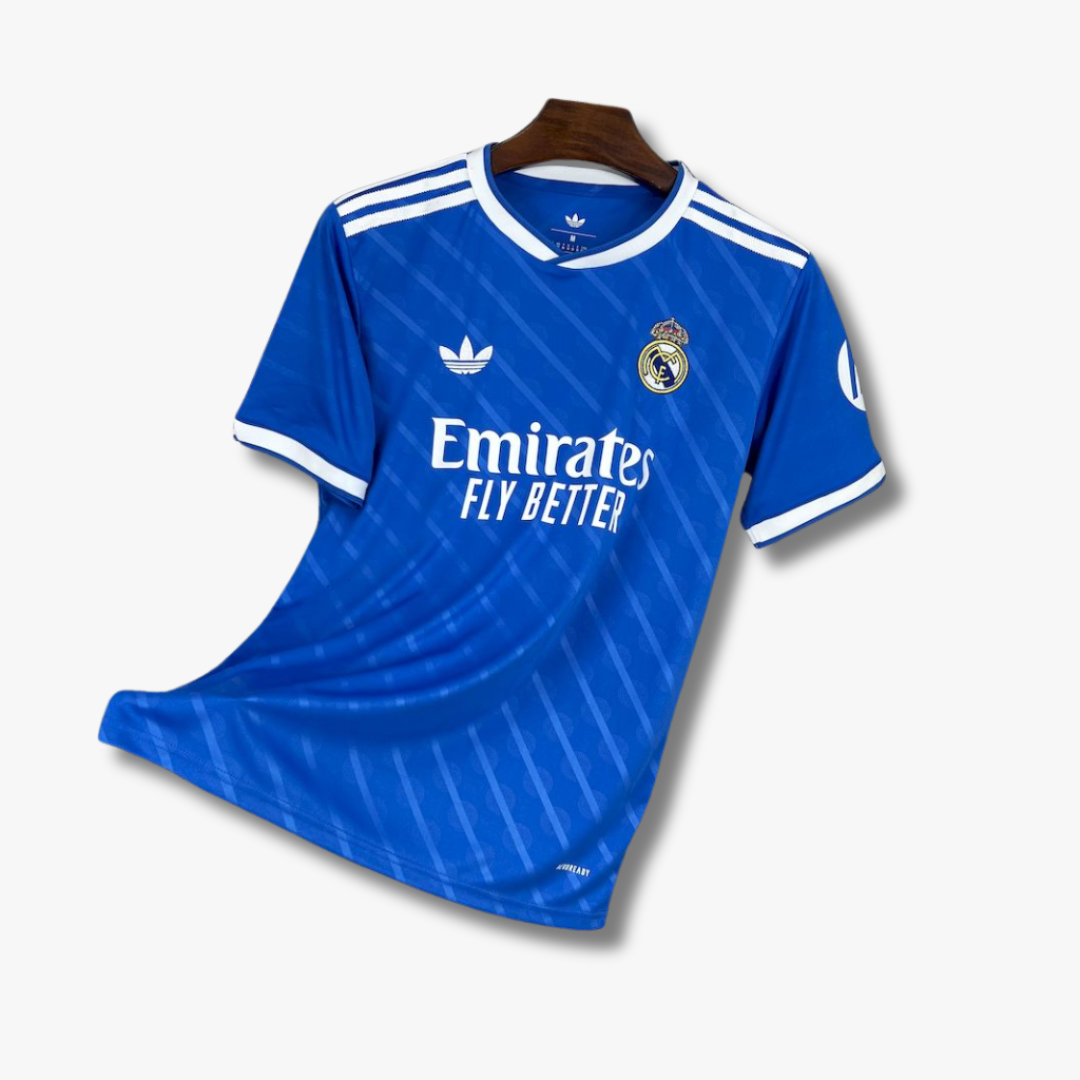 Este jersey Real Madrid Alternativo 25/26 destaca por su diseño elegante en azul intenso que transmite grandeza, carácter y modernidad. Los detalles en blanco en cuello y mangas aportan un contraste clásico que mantiene la esencia del club, mientras que el patrón sutil integrado en el tejido añade profundidad y dinamismo. El escudo en el pecho representa la historia, la ambición y el legado ganador del conjunto merengue, convirtiendo esta prenda en un símbolo de orgullo dentro y fuera del terreno de juego.