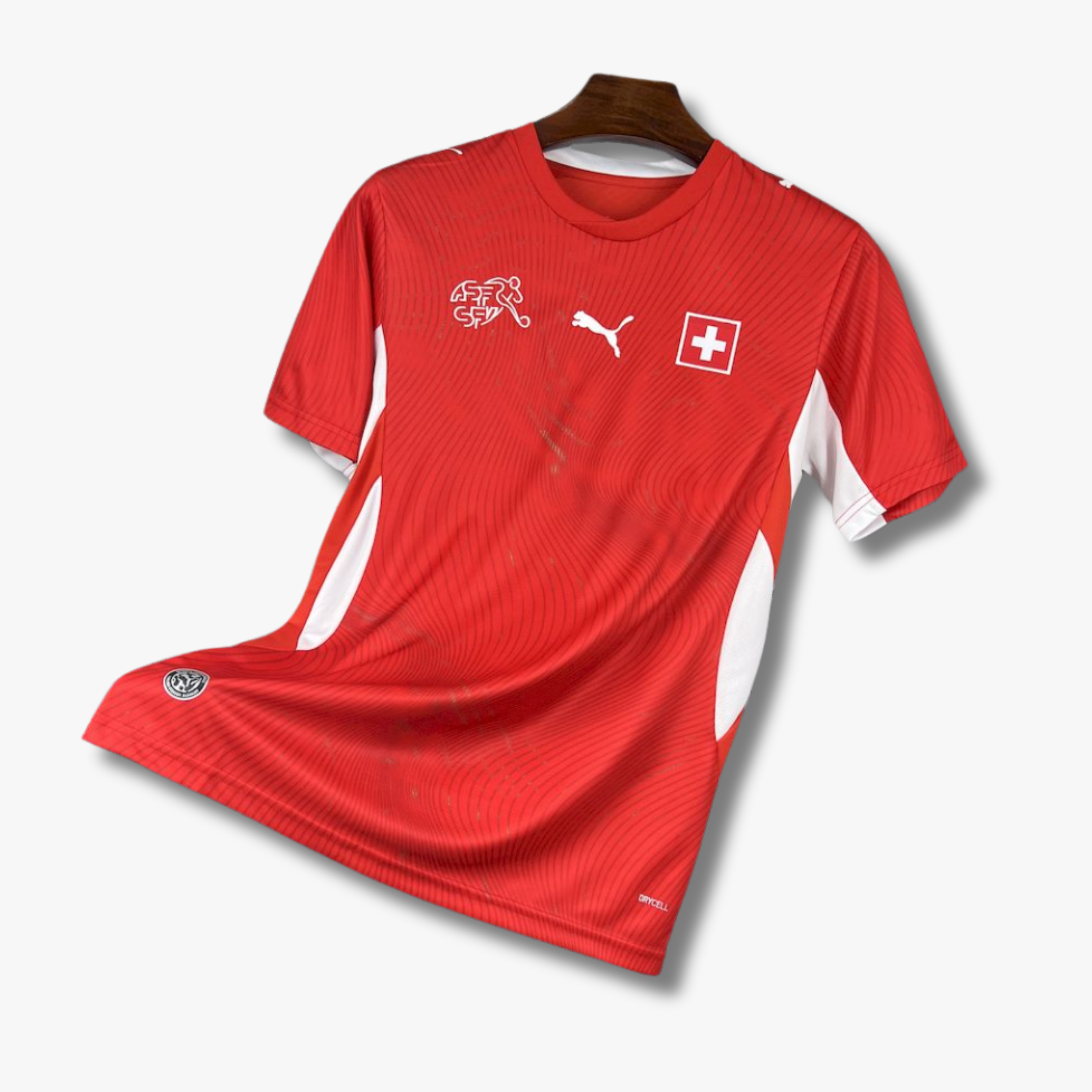 El patrón sutil integrado en la tela añade textura y dinamismo sin perder sobriedad, convirtiéndola en una prenda ideal para aficionados que desean representar a Suiza dentro y fuera de la cancha, ya sea en partidos, en la calle o como parte de su colección.