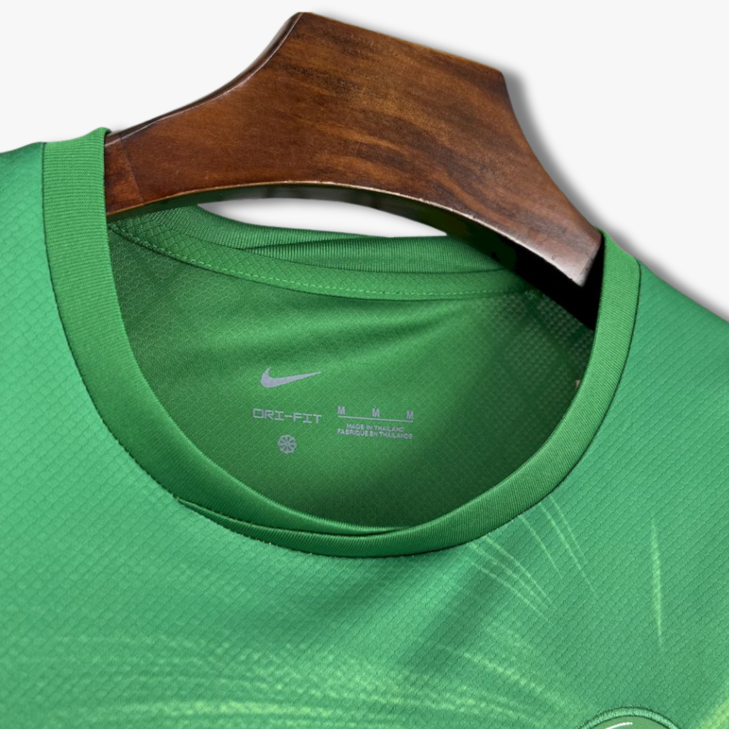 El escudo del club se presenta en aplicación de alta calidad sobre el pecho, perfectamente integrado al diseño. El patrocinador central en blanco genera un contraste limpio y equilibrado, destacando sobre el fondo verde. El cuello redondo en el mismo tono mantiene una estética minimalista y deportiva, reforzando la identidad contemporánea del conjunto.